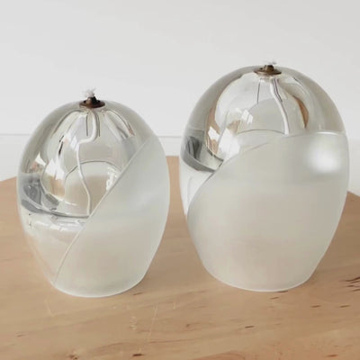 Een set glazen olielampen die direct opvalt door de combinatie van mat en helder glas. Het stevige materiaal en de afgeronde vorm geven de lampen een rustige en stijlvolle uitstraling. Ze zijn pre-loved, in goede staat en voorzien van een nieuwe lont, waardoor ze direct klaar zijn voor gebruik.
