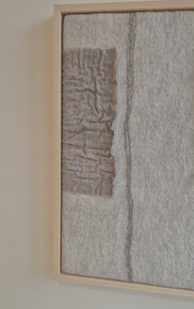 Het kunstwerk is volledig met de hand gevilt van merinowol en andere natuurlijke vezels. De compositie is bewust niet strak of symmetrisch. Wol en textiel mochten hun eigen richting volgen, wat resulteert in een organisch beeld met een natuurlijke spanning tussen zachtheid en structuur. Naturel-, beige- en lichtgrijze tinten vormen de basis, aangevuld met verfijnde textuurverschillen die het oppervlak levendig houden.