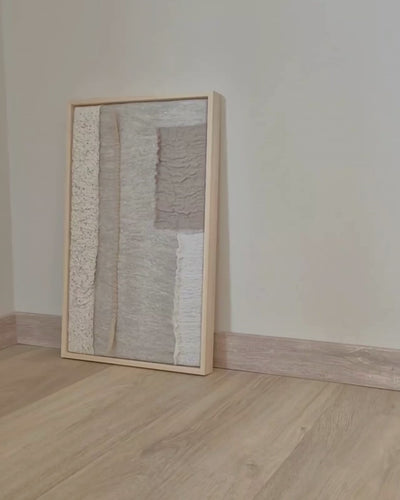 Een handgevilt wandobject in zachte naturel-, beige- en lichtgrijze tinten. Imperfectus IX brengt rust, ritme en verfijnde textuur samen in een stille, uitgebalanceerde compositie.