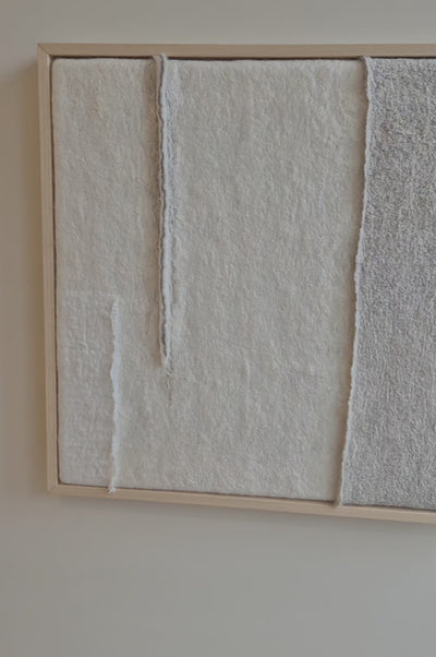 Het kunstwerk is volledig met de hand gevilt van merinowol en natuurlijke vezels. Smalle, verticale lijnen lopen als zachte reliëfs door het oppervlak en geven het werk diepte zonder onrust. De lichte variatie in textuur — van compact gevilt tot losser en luchtiger — maakt dat Imperfectus I zich langzaam laat ontdekken, afhankelijk van licht en kijkhoek.