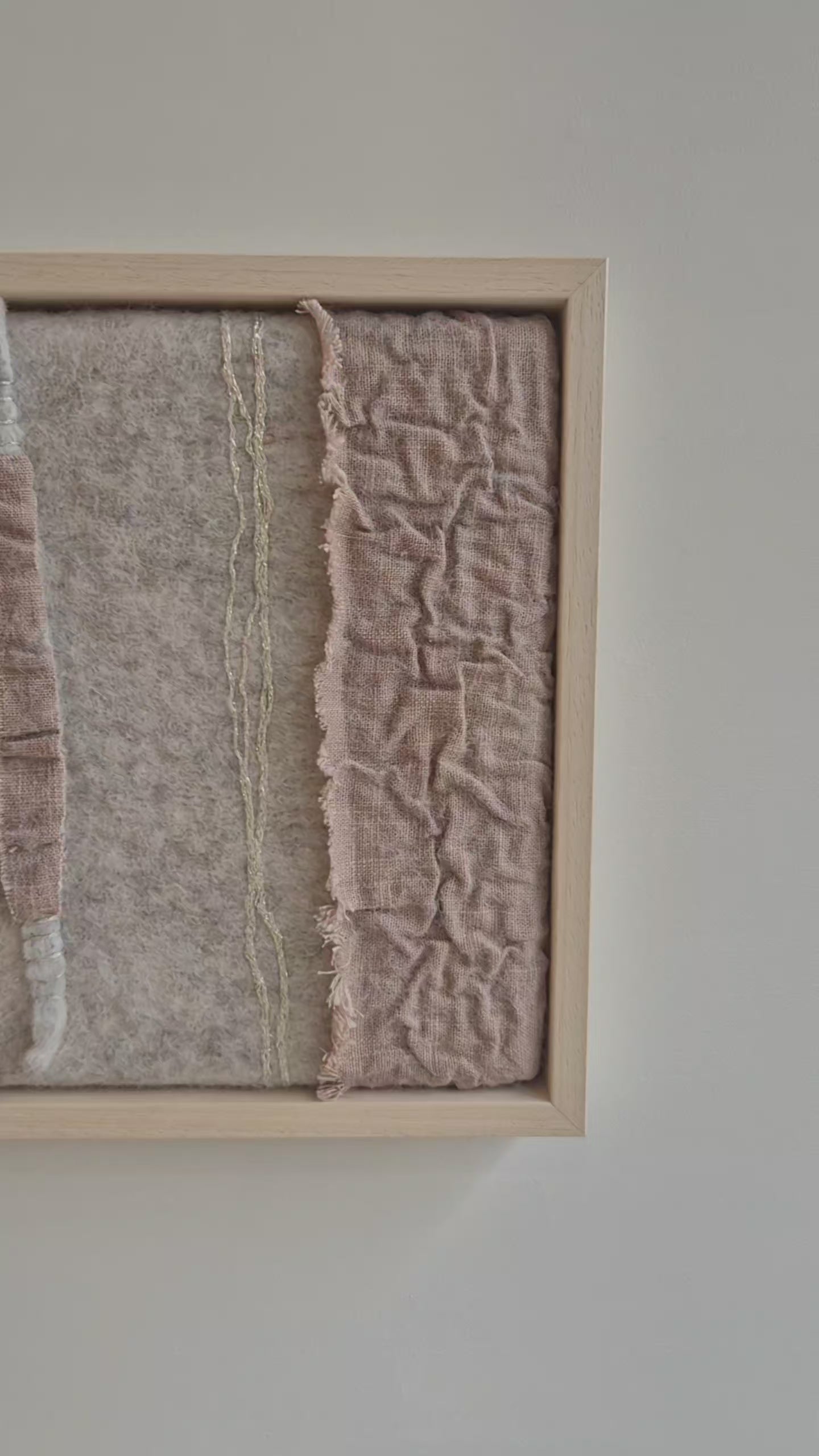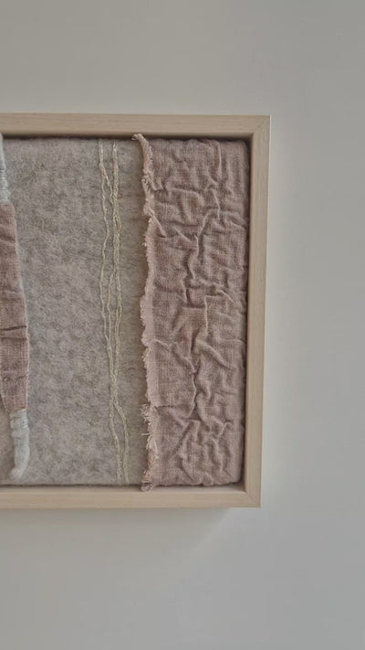 Het kunstwerk is volledig met de hand gevilt van mulesing-vrije merinowol en andere natuurlijke vezels. De compositie is bewust los en niet symmetrisch opgebouwd. Het materiaal mocht zijn eigen richting volgen, wat zorgt voor een organische uitstraling en een natuurlijke balans. De combinatie van zachte grijstinten, beige en een poederachtig roze-bruin vlak geeft het werk diepte en verfijning.