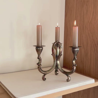 Deze vintage 3-armige kandelaar valt op door haar rustige, uitgebalanceerde vorm. De drie armen buigen gelijkmatig naar buiten en komen samen in een compact, sculpturaal middendeel.